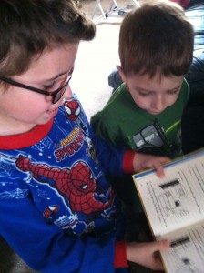 Thade was sharing one of his very favorite books with Dylan and I. Dylan is learning to read, and he is doing very well at it too.