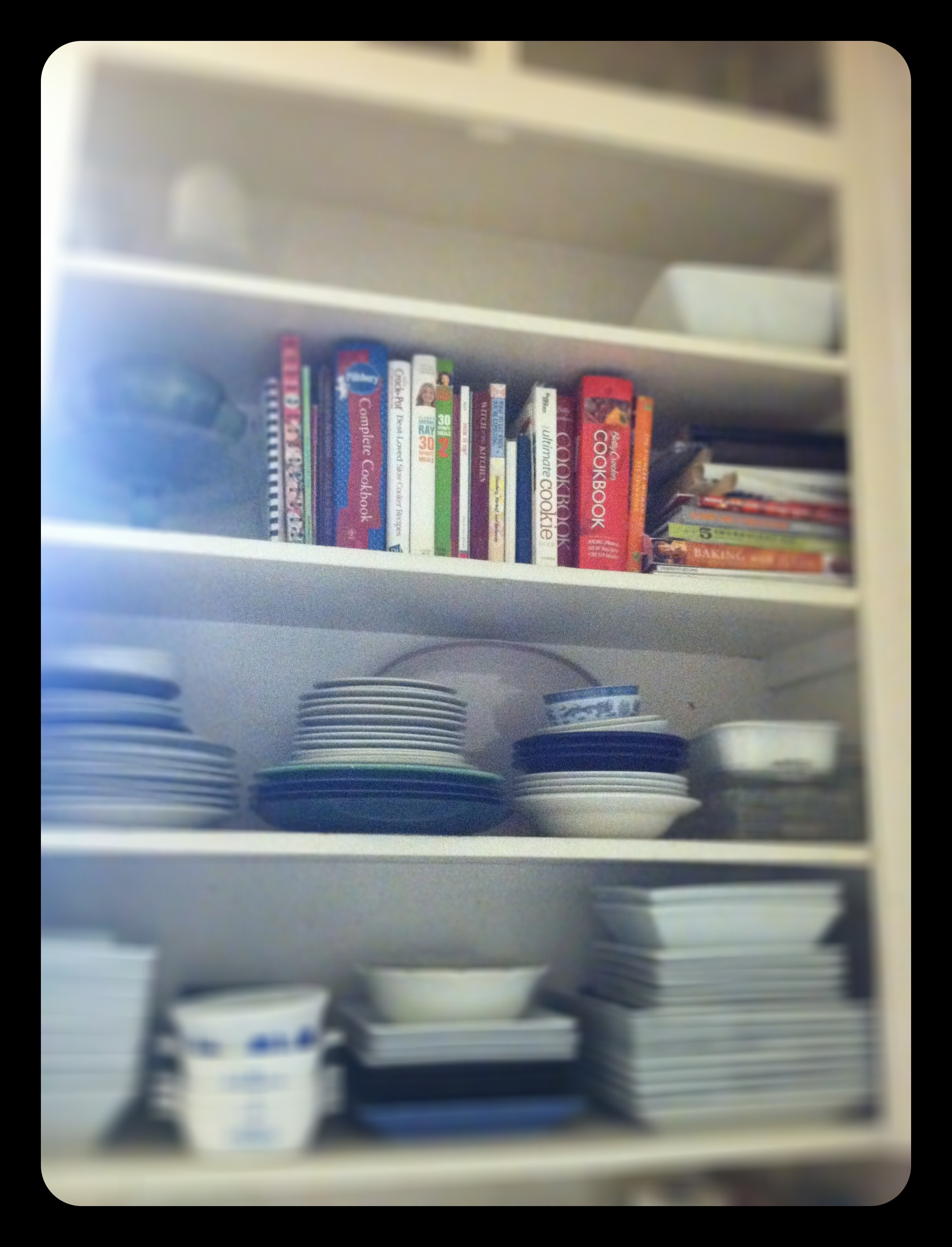 I also switched the kitchen shelves around a bit. I’ve put all of the dishes, and cookbooks on the upper shelves. The lower shelves hold all of the pantry items.