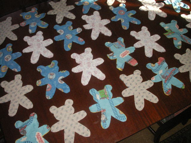 Yesterday was a very productive Bear day. While James was home for Lunch, I cut out all of the Girl Bears, and while Dylan took a nap, I sewed them all. This was a record for me 16 bears in 2 hours, not too bad.