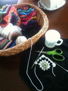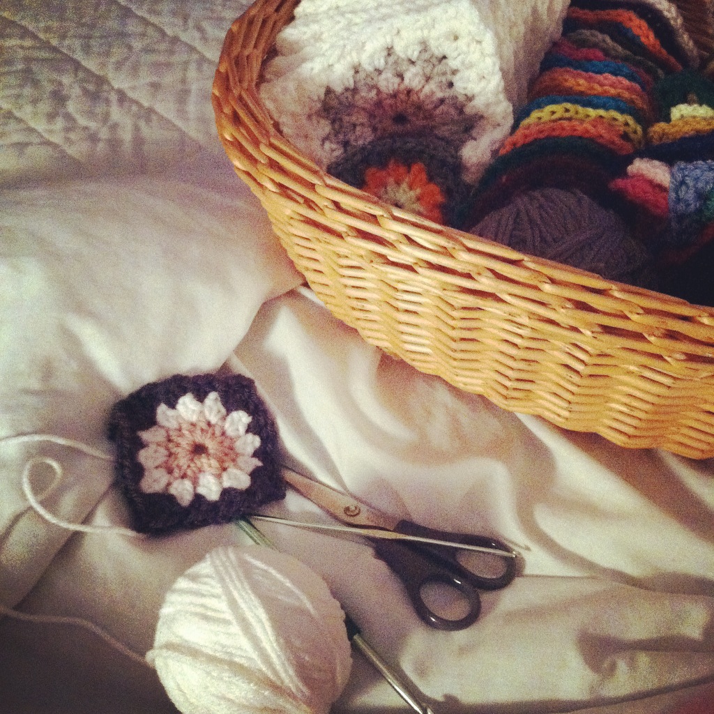 I keep this project in a laundry basket and take it all over the house. I work on it a row at a time, whenever I get a minute.