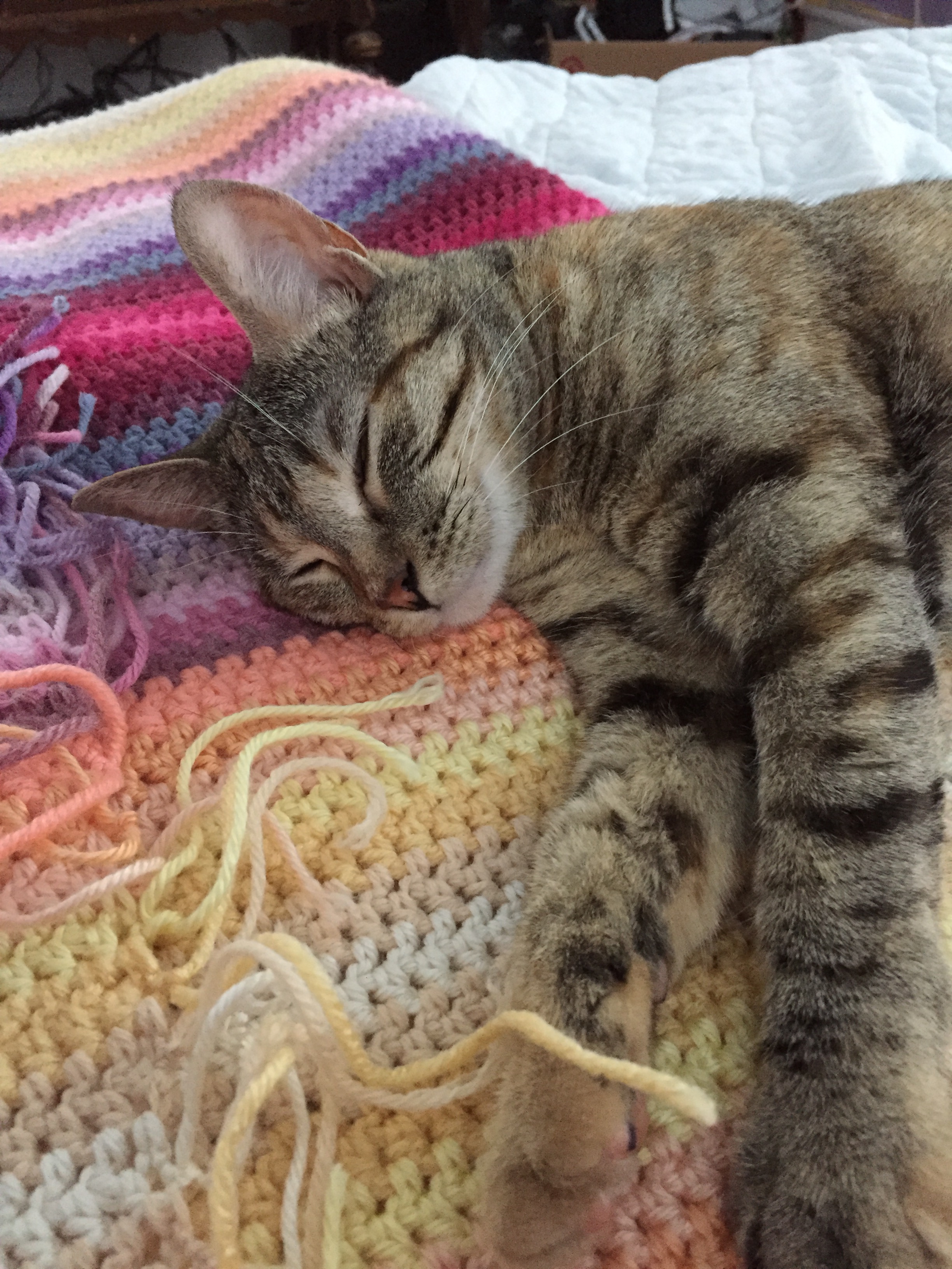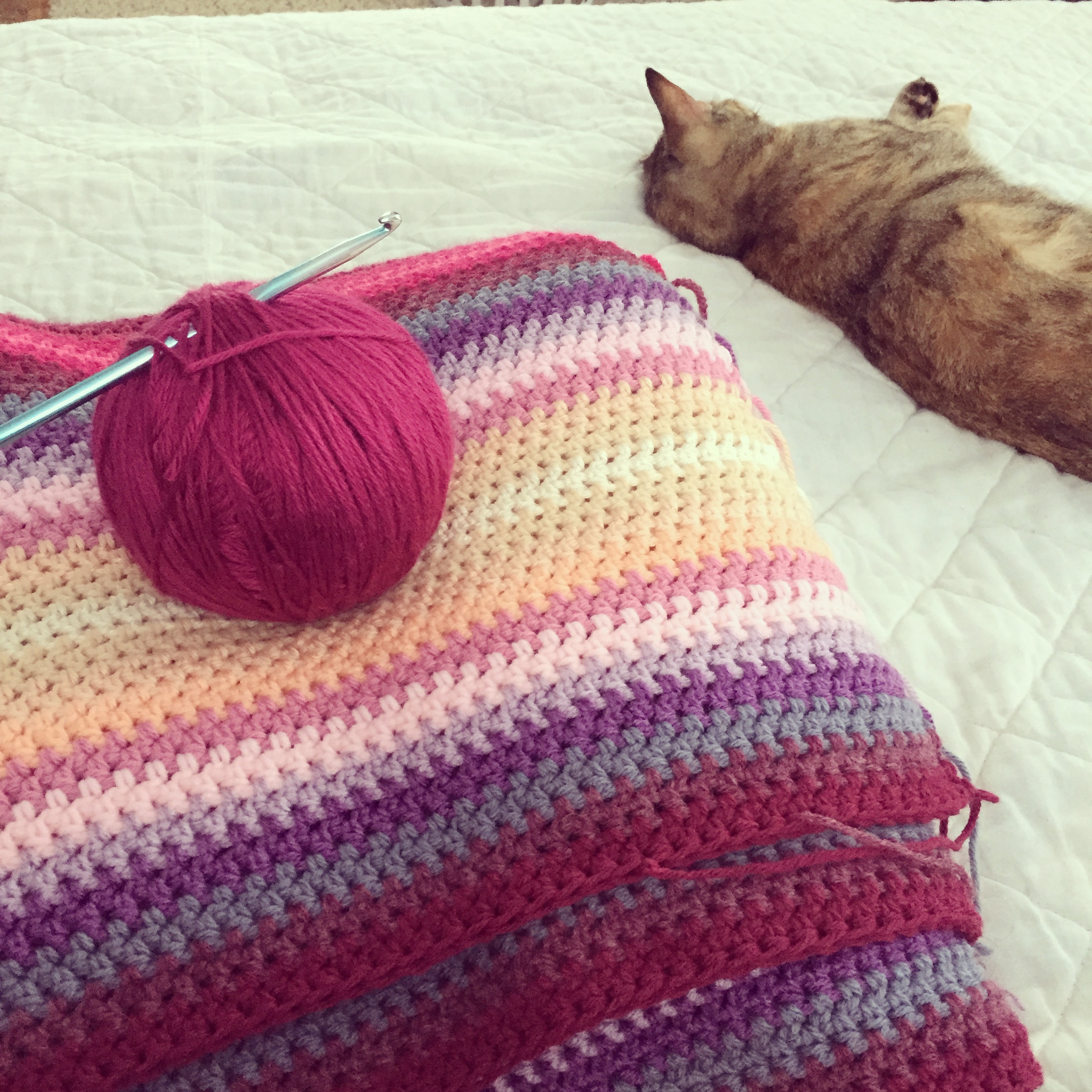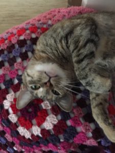 Agnes’ blanket is still a very much work in progress. Every time I start working on this little project, Jinx runs up, and naps right away. I try and move her, and she just plops right back down on it. This one still has a good sixty rows to go, if Jinx will let me.