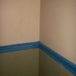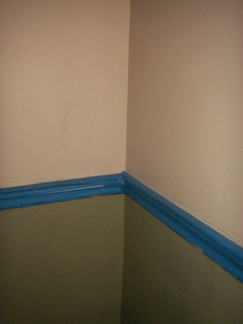 This is what the dining room looked like yesterday, beige paint, and plenty of blue tape everywhere.