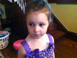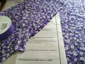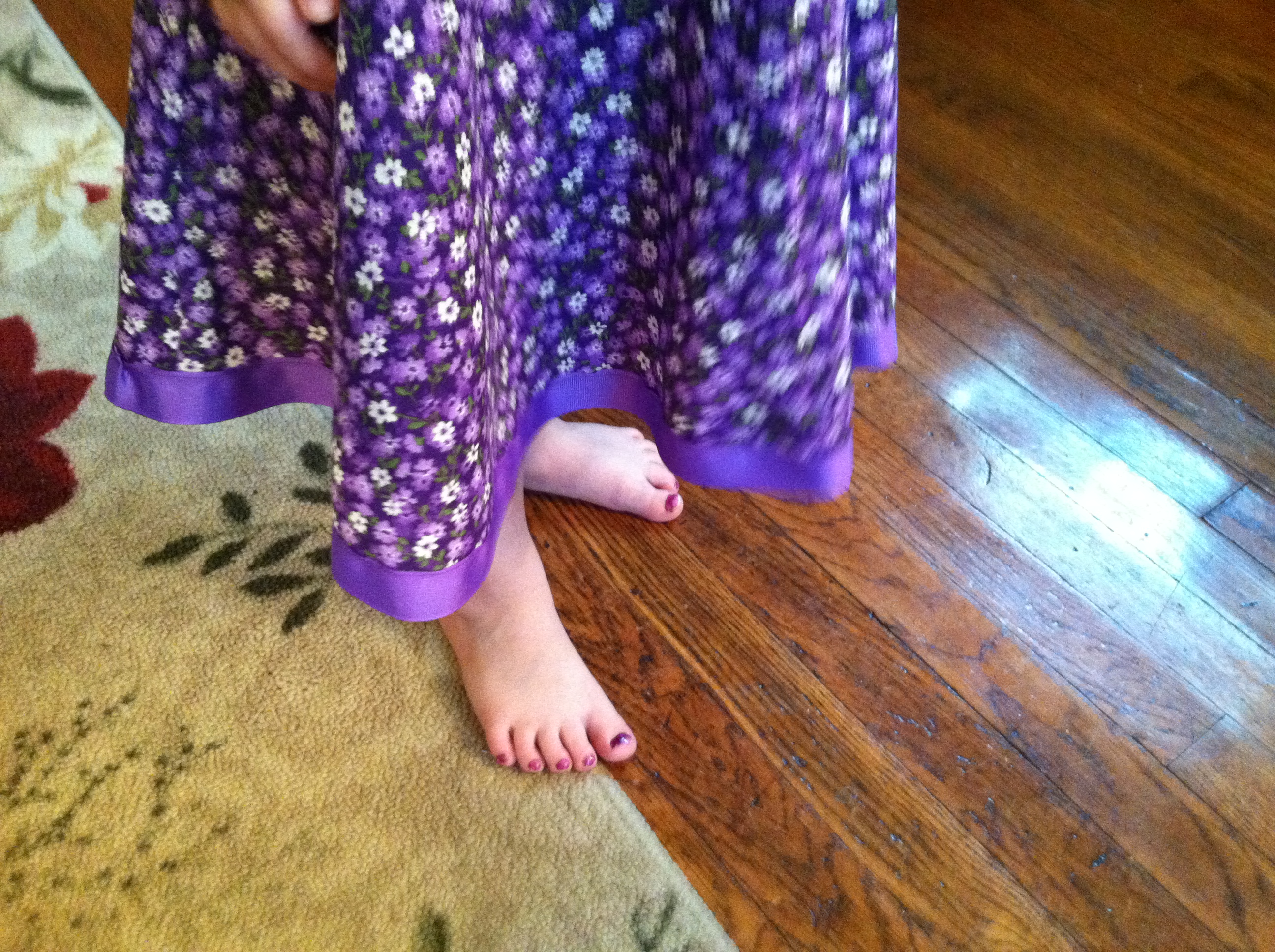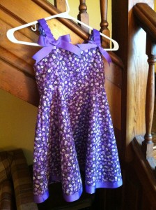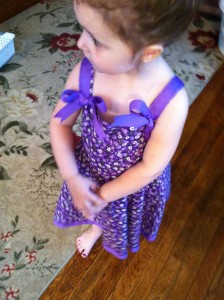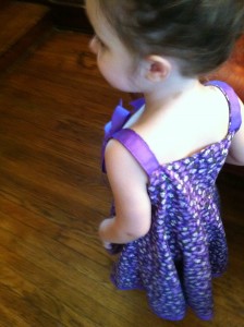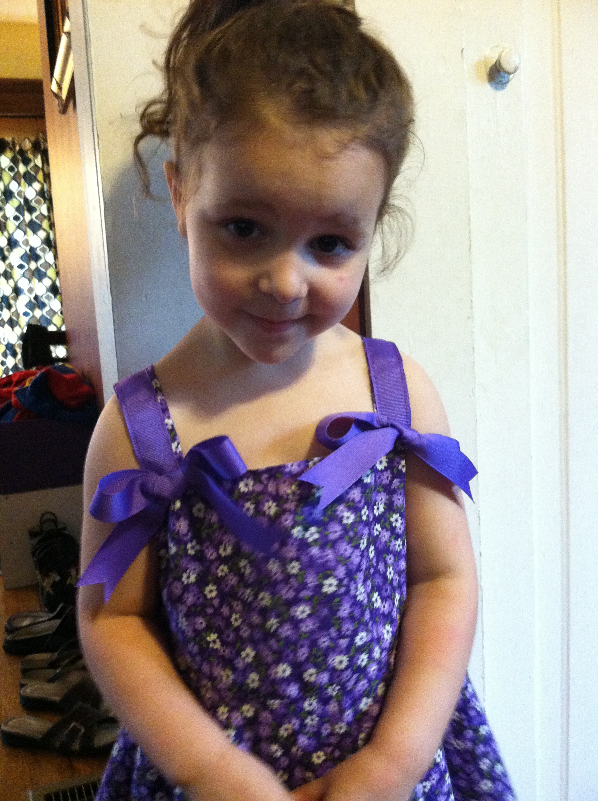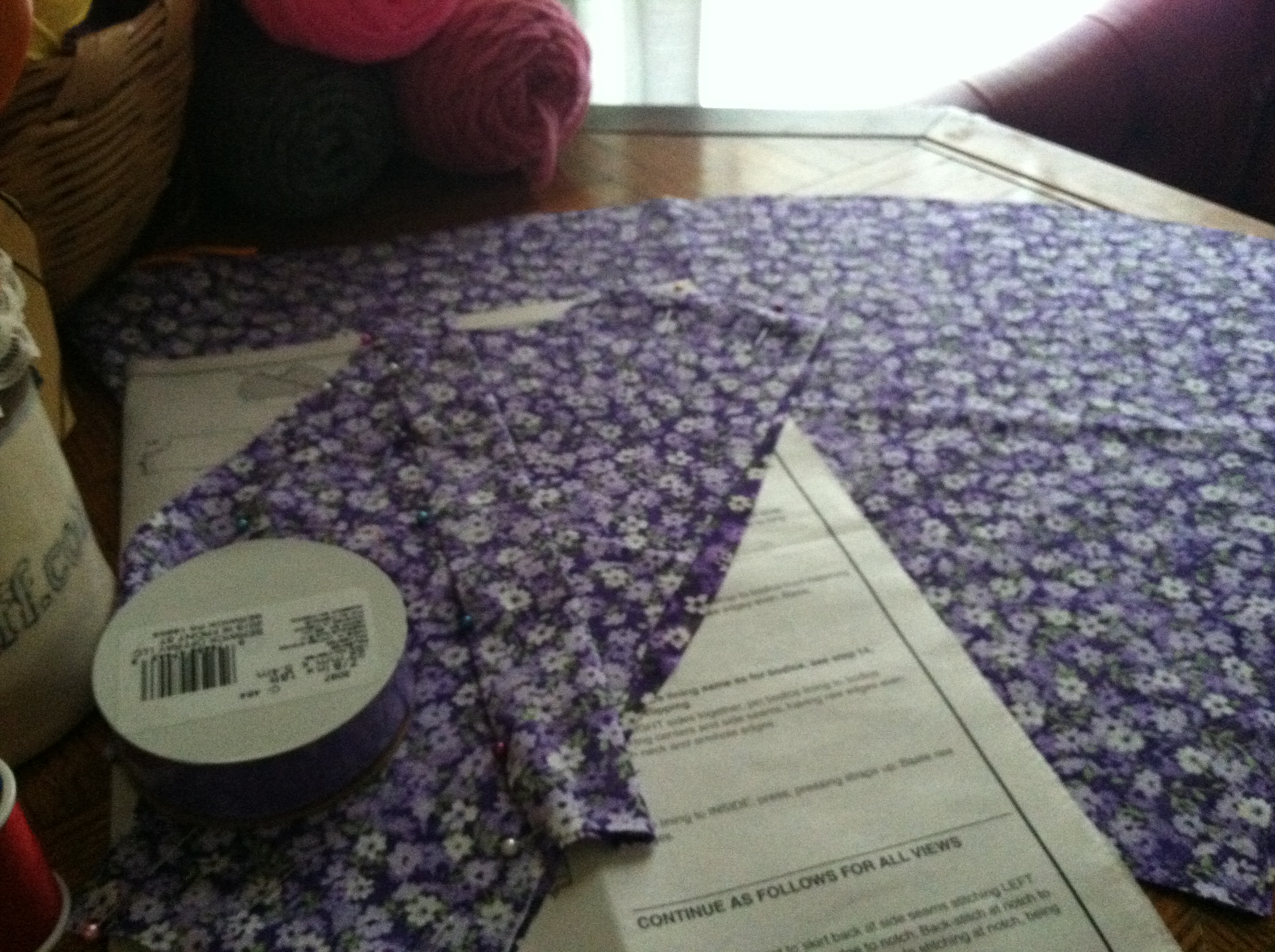 We looked through the patterns, and decided to give it a try. Agnes picked out some pretty purple fabric. Purple seems to be her favorite color these days.