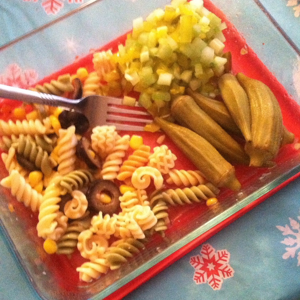 Pasta Salad, Pickled Okra, and Celery Slaw.