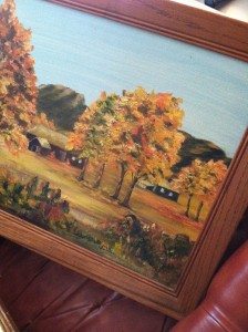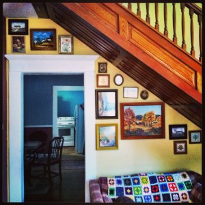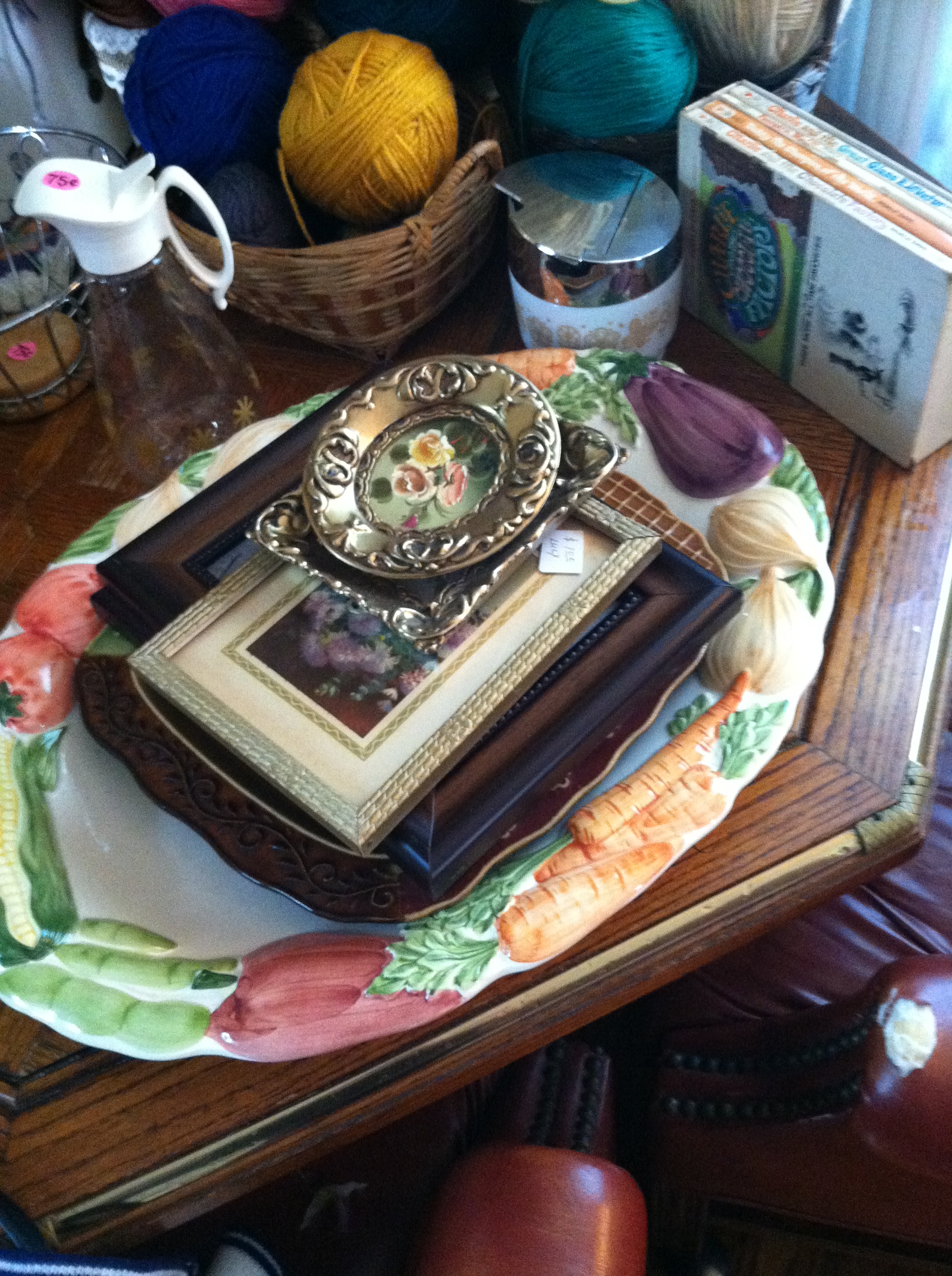 I found a few more pictures to add to the wall of kitschy-art, and a few Pyrex pie plates too. I found a fantastic wooden cutting board, and this little beauty too…