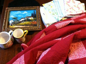 We found a few vintage pillow cases, a cool painting, a few mugs too. The best buy was the red quilt. I picked it up for just $5.00.