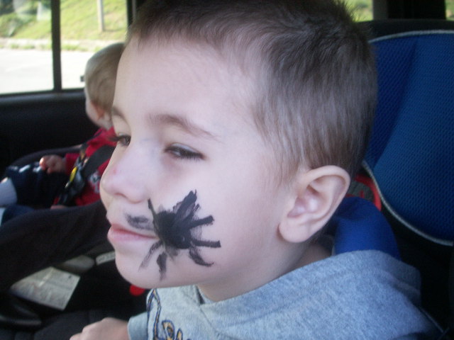 We got to make Treat Bags, and decorate pumpkins too. Thade loved the buttons the best. I have to agree, they were so cute. Thade even got a scary spider painted on his cheek.