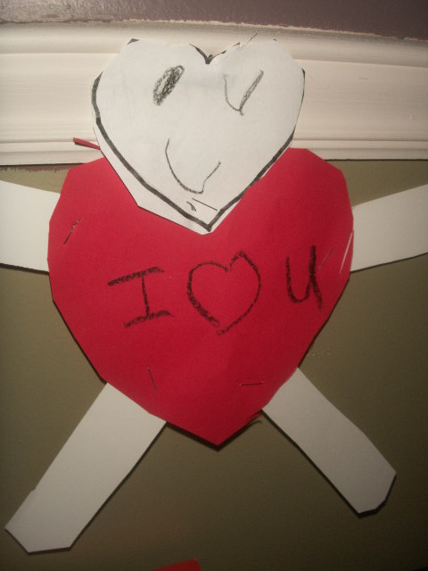 Thade has been busy at school making crafts for the house. He made the cute I heart U guy for my desk, and a pretty pink and gold glitter heart for the front door.
