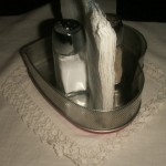 I’ve reused a heart shaped mesh tin and salt and pepper shakers to make a Valentine’s Day napkin holder for the dining room table.