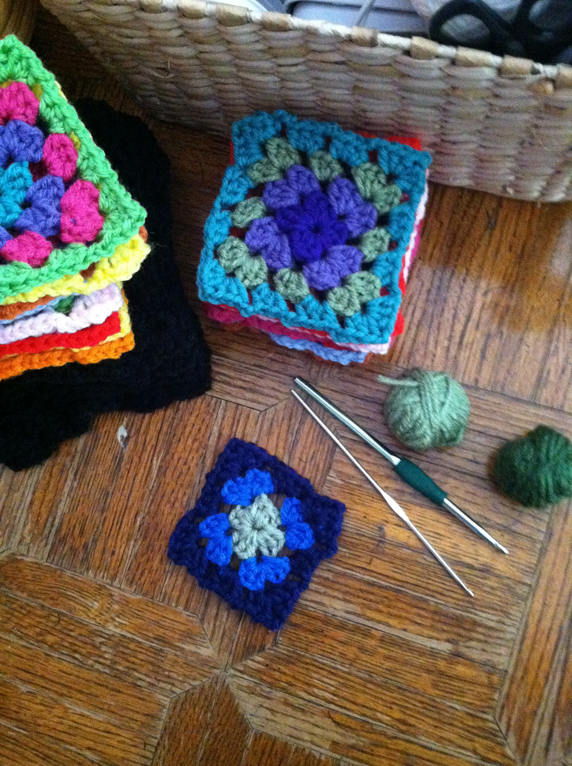 This first one is a gift in progress. I’ve been spotting lots of granny-square afghans in the antique shops, and I wanted to recreate it. I’m using brightly colored yarn, and then finishing it off with two more rows of black. It is a classic look, and fun to make.