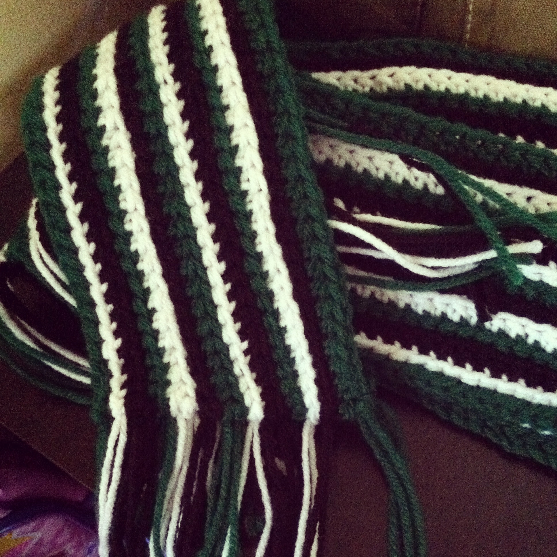 Lastly this one is a quick to crochet and complete gift. This scarf is for a fabulous Eagles fan. I hope she likes it. I added some fringe to complete the cuteness.