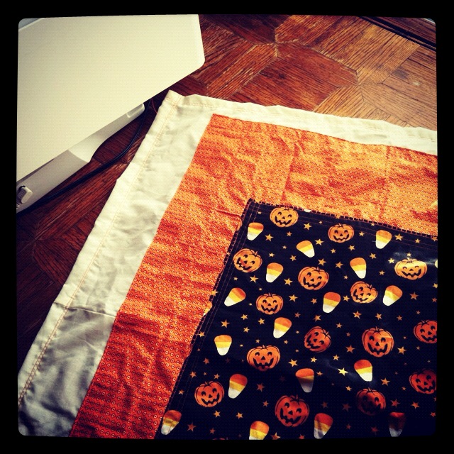 I’ve added more fabric, and now it is about the size of a small blanket. Maybe it will end up being a tablecloth for the Halloween candy table. I don’t know what it is yet, but it has been fun to sew.