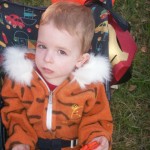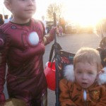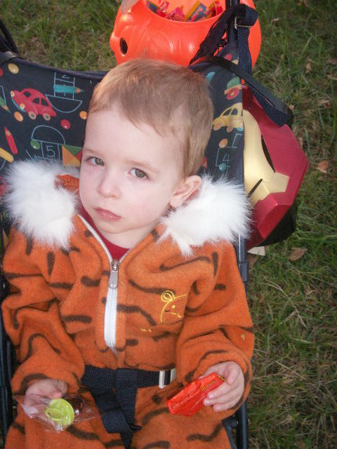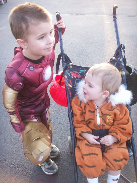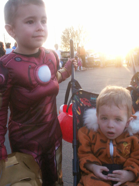 Shaunna brought Sheldon over in the afternoon, so we got all of the boy’s in their costumes and ready to go Trick-or-Treating. Shaunna and I decided to dress up too, and we needed a costume quickly, so we decided on dressing as 80’s Aerobic Instructors. Our costumes were complete with side ponytails, scrunchies, leg warmers, and lots of really bad blue eyeshadow.