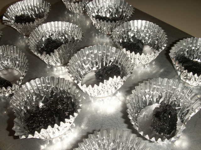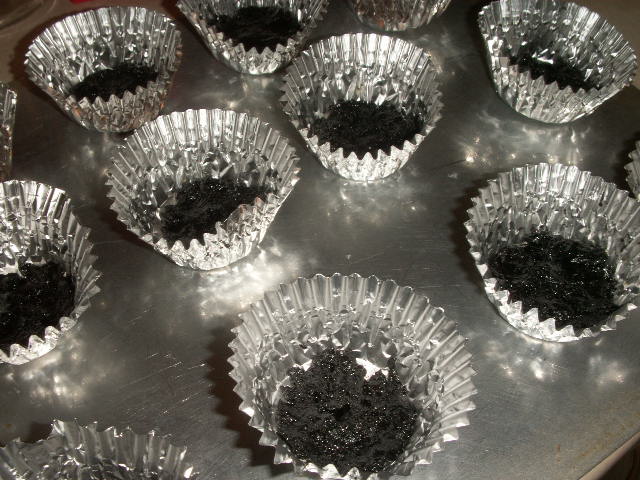 Preheat your oven to 350 degrees, and get out your Aluminum Cupcake Liners. I used 12 liners, and mine were also paper lined, so I removed the paper liner, but saved the paper liner for later baking… Give the Aluminum Liner a little spray with the PAM, and place a spoonful of the Oreo cookie mixture in each liner. Smooth the mixture out, and bake for about 5-7 minutes, just until the cookie is set.