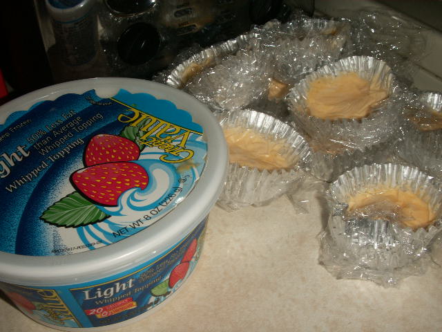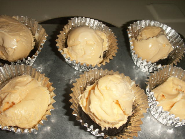 After the Cookies have cooled, give the liners one more tiny spray of PAM, just to make sure that nothing is going to stick. Add a scoop of Ice Cream to each of the liners, and smooth out the scoops with your Butter Knife. Carefully wrap each of the Ice Cream Cupcakes with Plastic Wrap, and place them in the freezer until you are ready to Ice them.