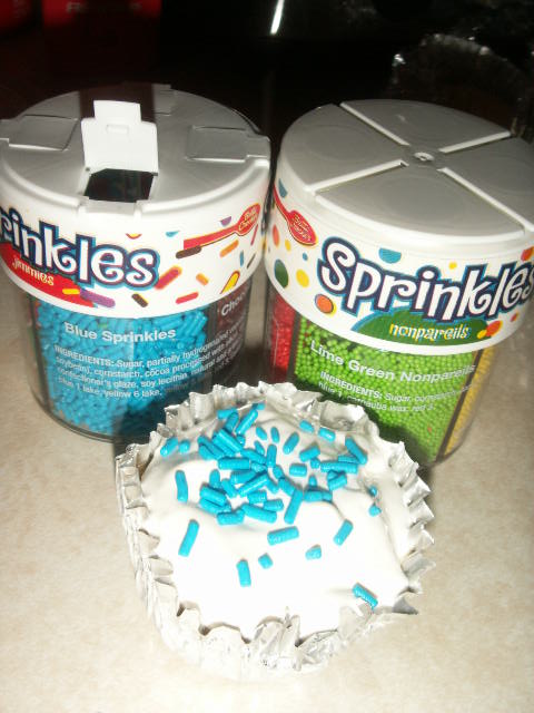 Let your Cool Whip soften just a bit, and unwrap your Ice Cream Cupcakes. Top the Ice Cream Cupcakes with the Cool Whip “icing”, and use your favorite sprinkles to decorate. If it isn’t party time just yet, place the Iced Cupcakes back in the freezer till its time for the Party 🙂