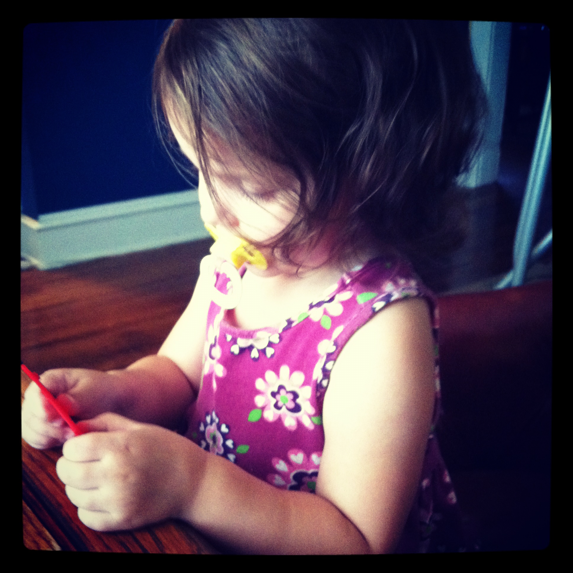Agnes has been my little shadow this month. Here she was pretending to take pictures of a tote that I was sewing.
