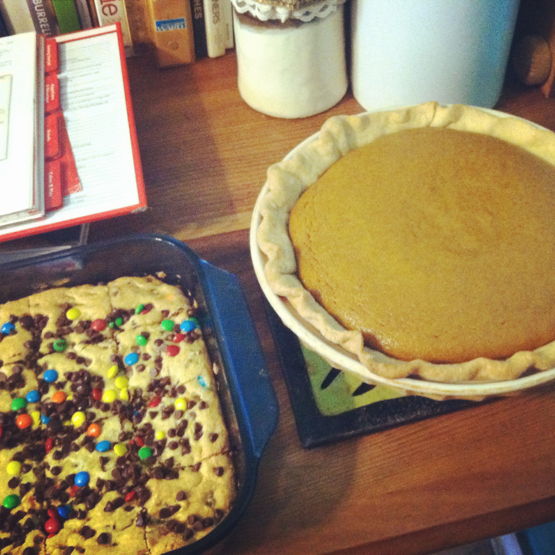 Even though we are right in the middle of Summer, I missed Autumn. Nothing says Autumn comfort foods like Chicken and Noodles complete with Pumpkin Pie. I also made a big pan of Cookie Bars. The kids love them.