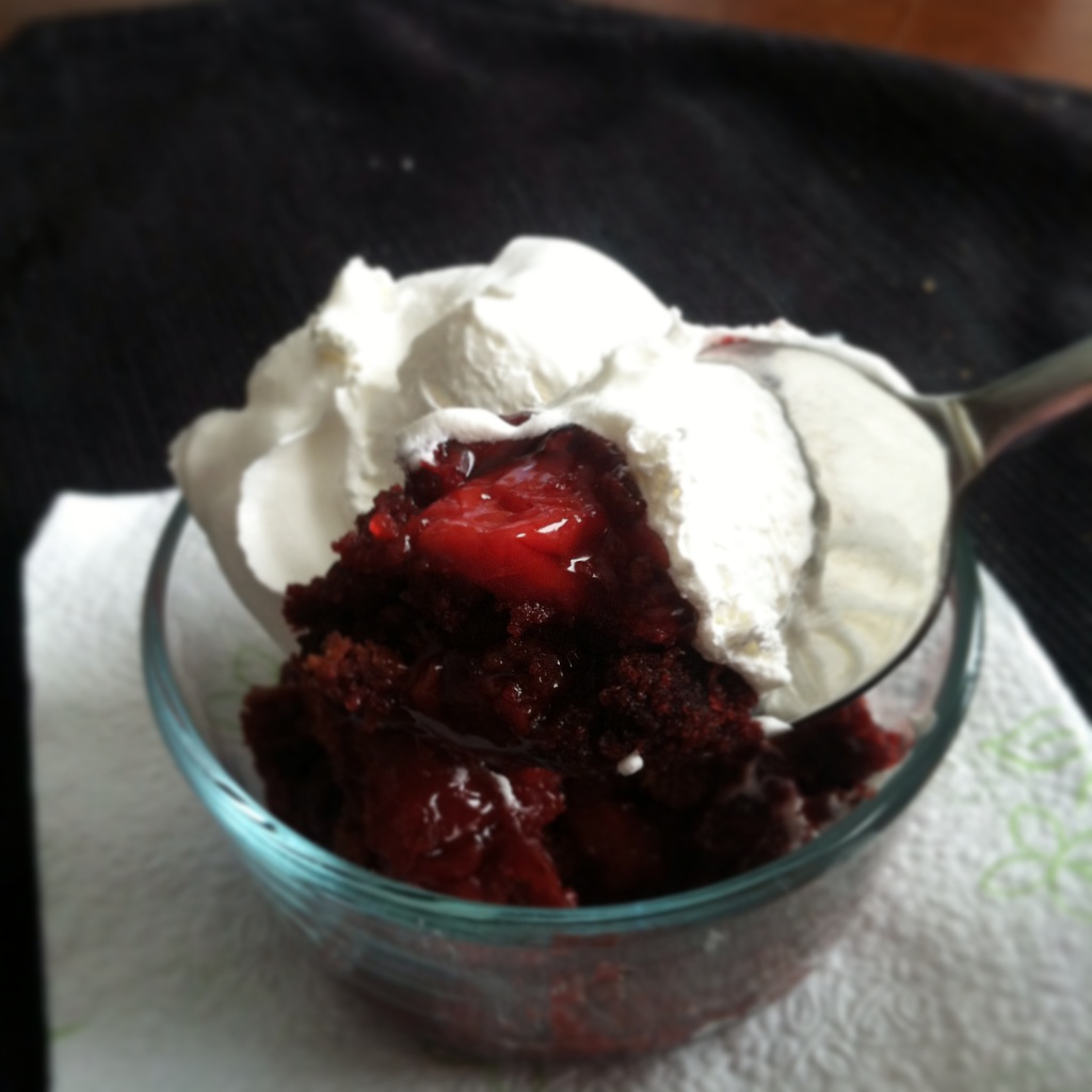 Lastly, I wanted to make dessert, but I didn’t want to leave the house for supplies. I found a recipe on pinterest for Dump Cake, and used what I had in the pantry. I made a Red Velvet Cherry Dump Cake, and it was delicious. The tiny kiddos liked it too.