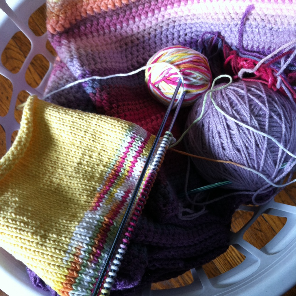 This is my downstairs works-in-progress basket. I drag it from room to room, and work on my little projects whenever I can.