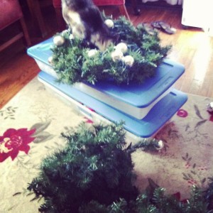 The kitty wanted to help too. Every year he eats one of the wreaths, and takes out the Christmas tree. He is a bit of a stinker when it comes to decorating.