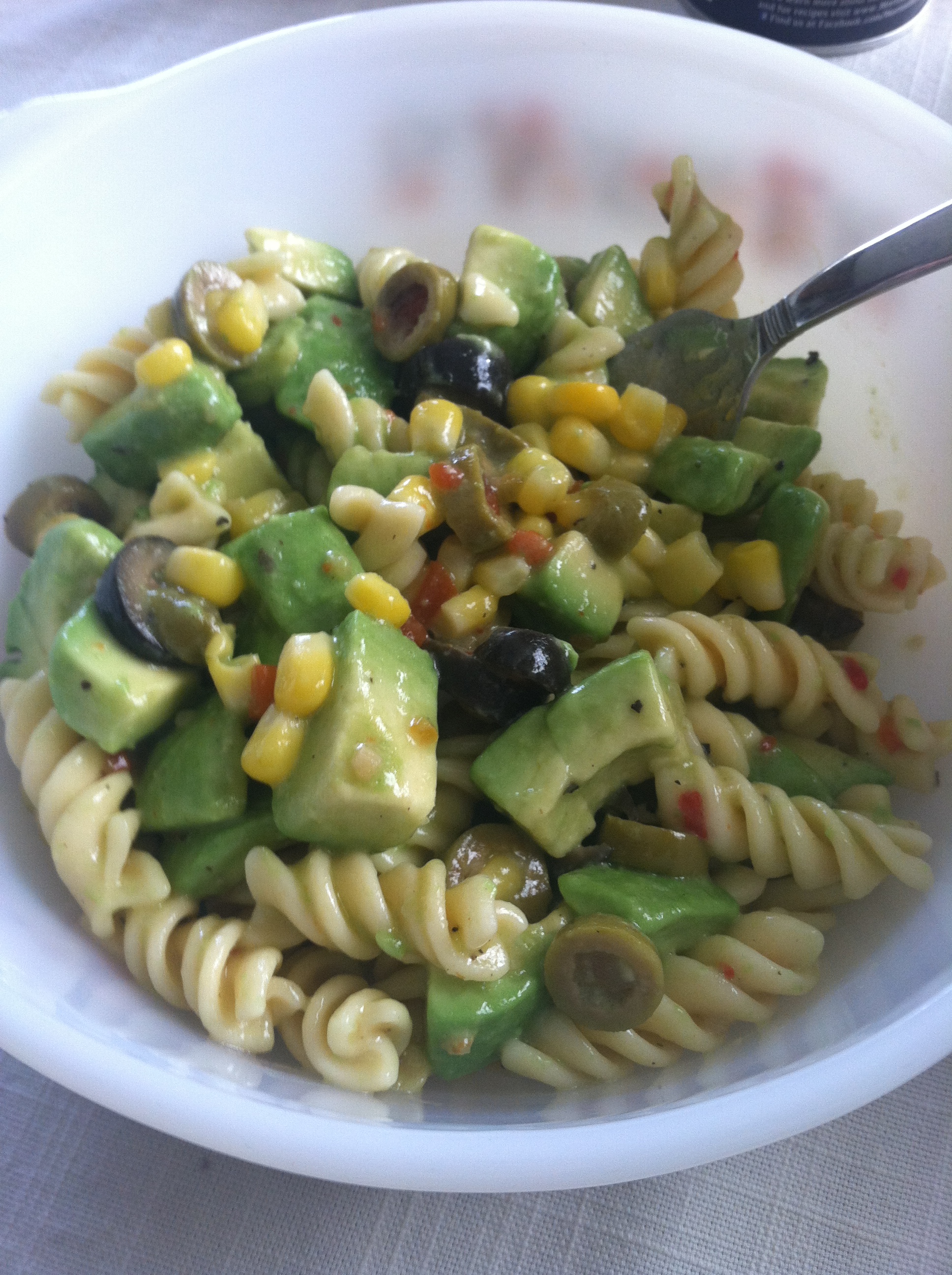 Loaded Vegan Pasta Salad and Black Olives. We were actually under a tornado watch, so we needed to get dinner done in a hurry.