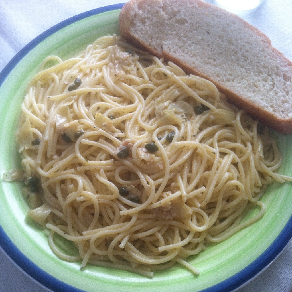 Vegetarian Lemon Pasta with Artichokes and Capers, fresh homemade bread rounds out this meal. I was craving Chicken Piccata, so I made a veggie version of it.