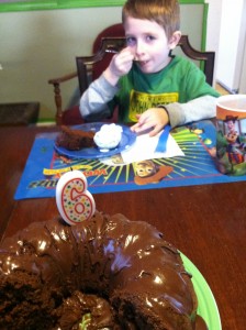 We celebrated Dylan’s 6th birthday. He wanted a Chocolate Bundt Cake.