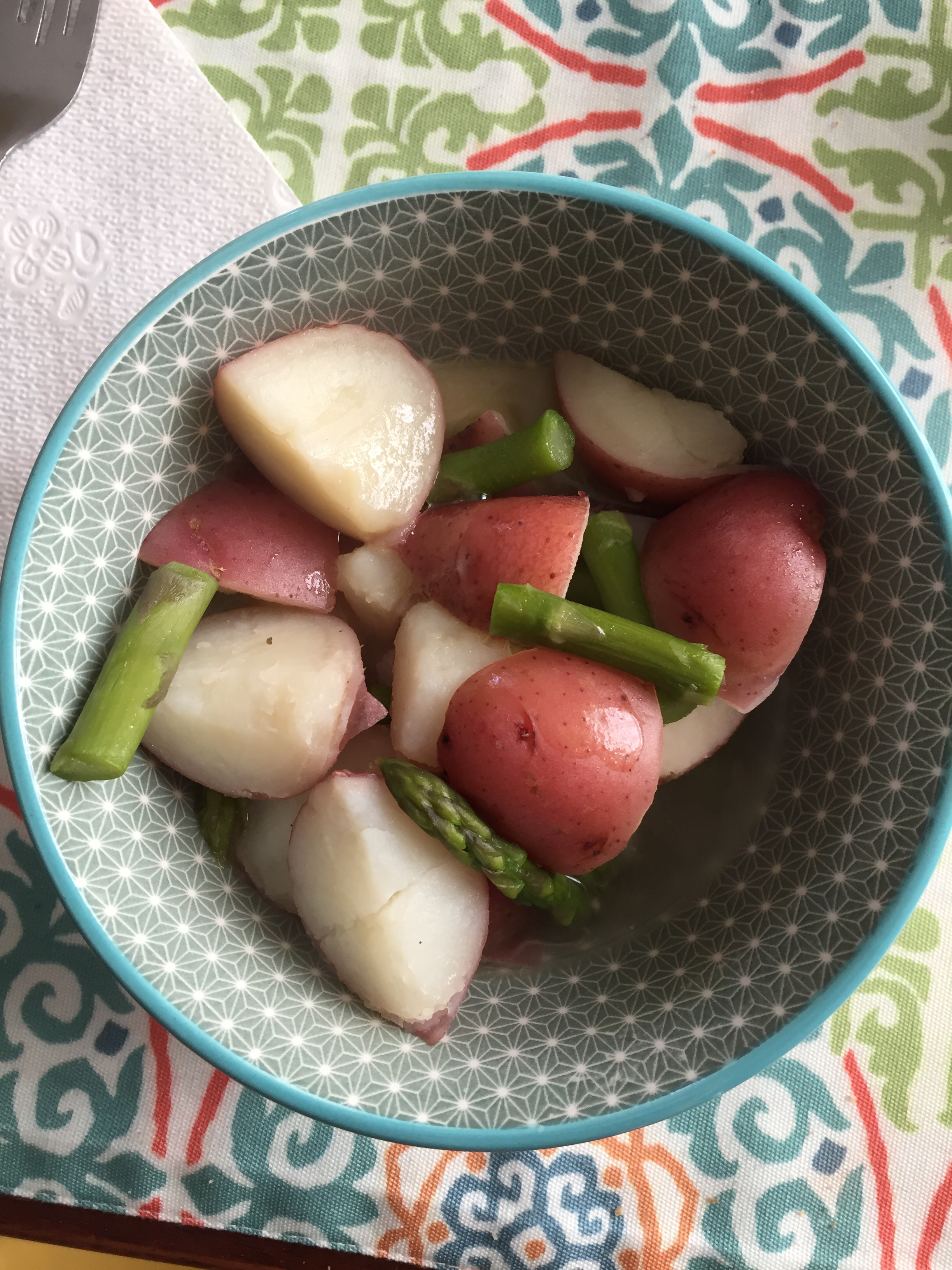 Simple boiled Red Potatoes with Asparagus. I added in just a bit of lemon juice to brighten up the asparagus. Both of these items were on sale at the store, so I made a big batch for leftovers.