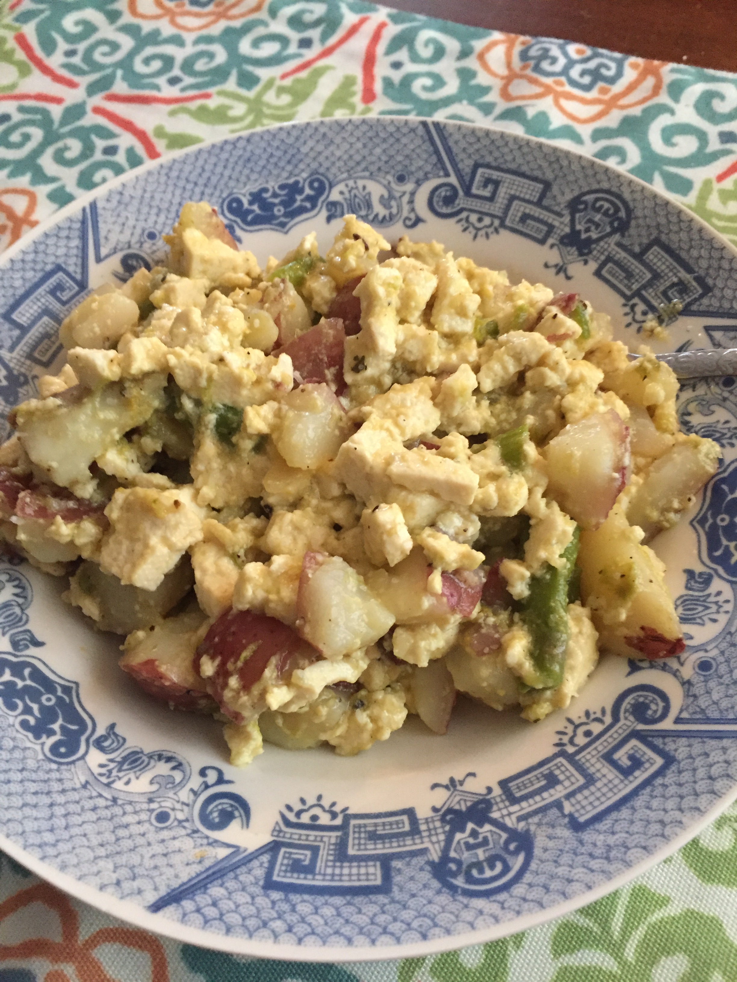 Here’s what I did with some of the leftovers. I made a Tofu Scramble with leftover Red Potatoes and Asparagus. This dish was delicious and filling. Once more the Tofu was on sale too, so this was a very inexpensive vegan meal.