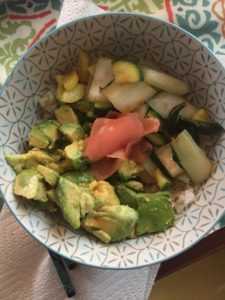 You know I love my vegan sushi, but some nights I need the sushi goodness a little faster. I had pre-cooked sushi rice in the fridge, and I made a quick bowl with Wasabi Avocados, Pickled Ginger, and Sauteed Bok Choy, Zucchini, and Yellow Squash. So tasty!