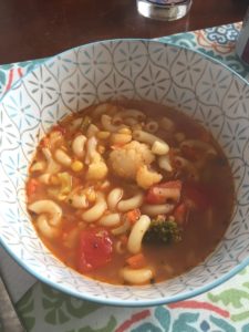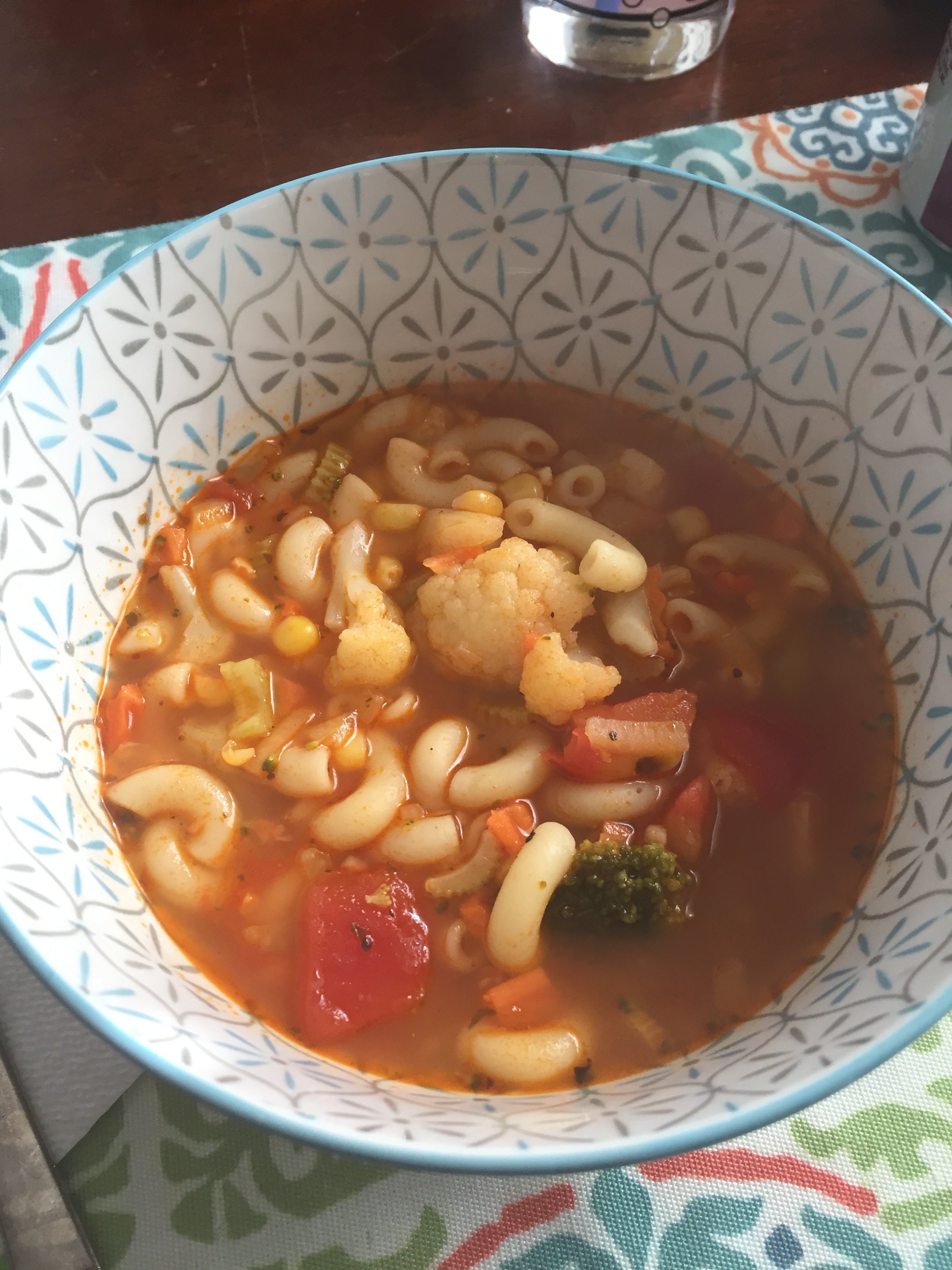 I took the some of the leftovers from lunch, and made a delicious veggie soup for dinner. I love cooking items that I can make into many meals.