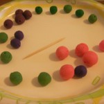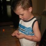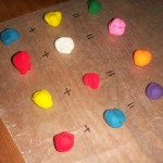 I thought it would be fun to make handmade beads, and learn a little about making secondary colors too. I asked Thade to wait in the other room while I set up the camp. I got out Play Doh, Waxed Paper, a Sharpie, one Paper Plate, and one Toothpick. I then spread out the waxed paper on the table and made color equations with the Play Doh and Sharpie (red+blue=Purple). I then let Thade squish away at the Play Doh and make the new color creations.
