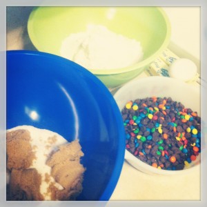 I had some leftover Mini M&M’s from Dylan’s Halloween Party. There were just enough to make a batch of cookies.