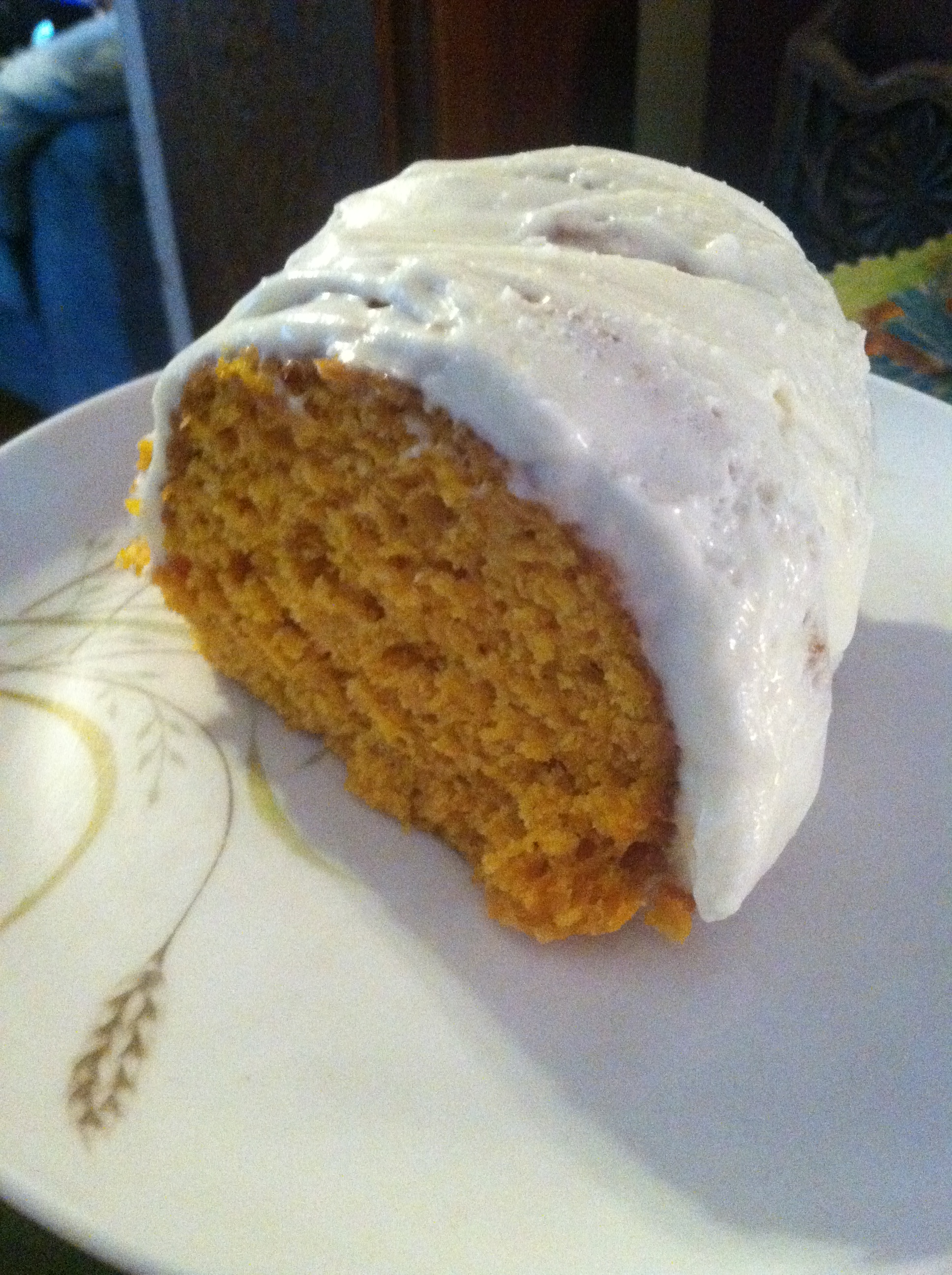 Weekend breakfast, leftover Pumpkin Bundt Cake with cream cheese frosting. It was so sweet and tasty.