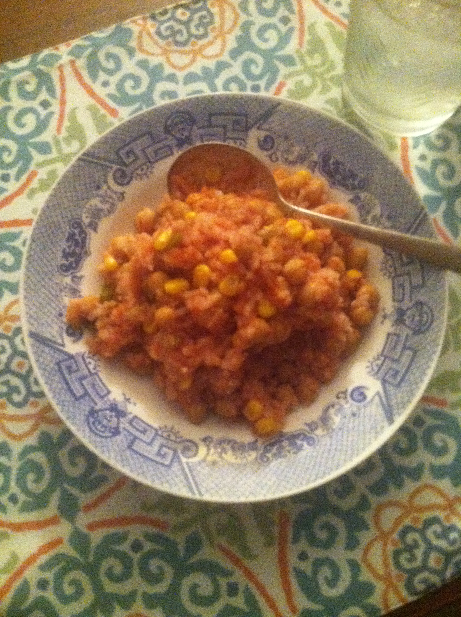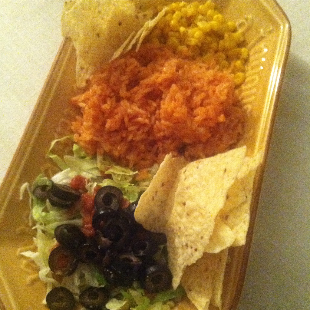 A little salad with salsa and black olives. Homemade Mexican Rice with Tortilla Chips. I even made some Chili-Lime Corn, that was crazy delicious.
