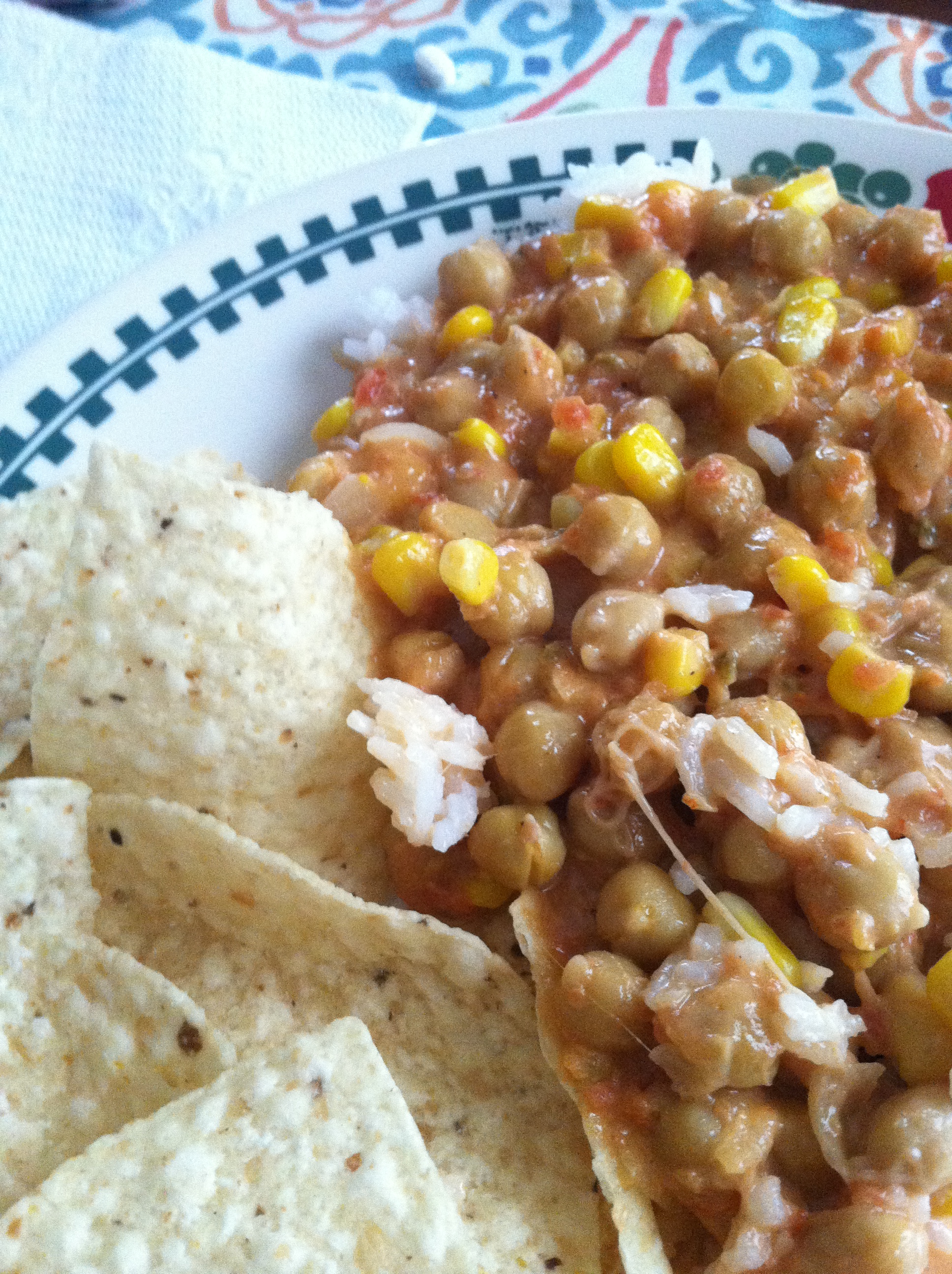 Sometimes vegetarian dishes aren’t the prettiest, but I have to say this is one of the tastiest ones I made. It’s nachos with chickpeas, homemade Mexican rice, corn, salsa, and cheese that I can’t have, but I did anyway.