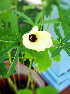 Our Okra finally bloomed. Okra blossoms are one of my very favorite blooms.