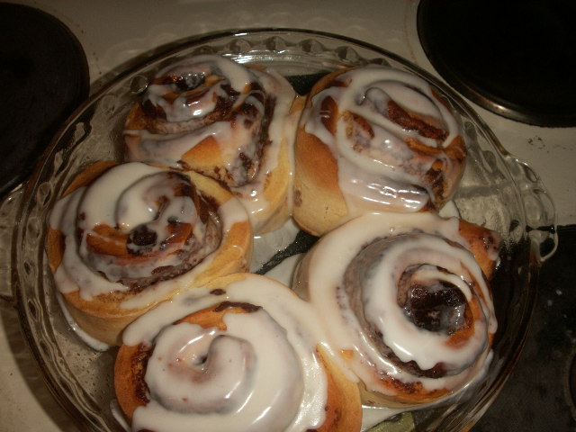 With the sounds of the rain, and the fact that both boys were up all night, I could not wake up this morning. Once again proving that Nico really isn’t a morning person. Once I finally got up and going I popped some Cinnamon Rolls in the oven, and called it good. Thade didn’t want to try them, so he was happy to have Lucky Charms, hubby was pretty happy though 🙂
