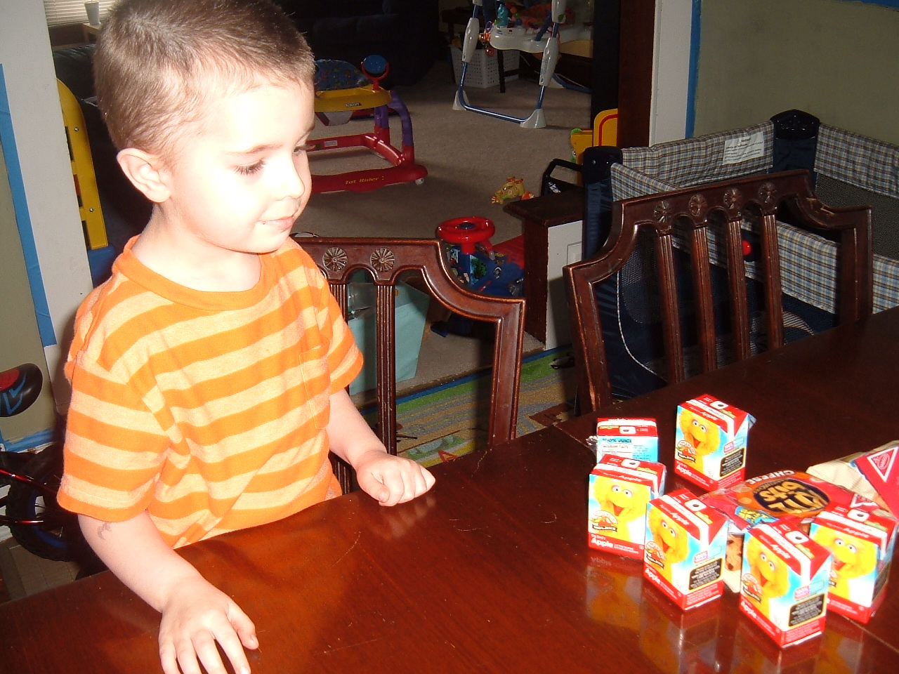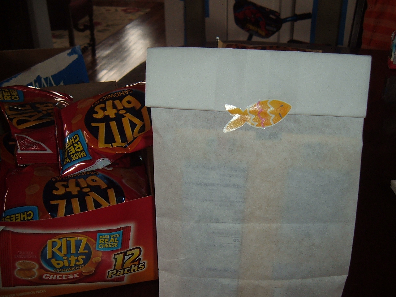 We set everything out on the table, and I put Thade in charge of the Apple Juice. He counted the little boxes over and over. He couldn’t wait to get to the game, and eat the snacks. We needed eleven snacks bags for the team, and I made one extra just in case.