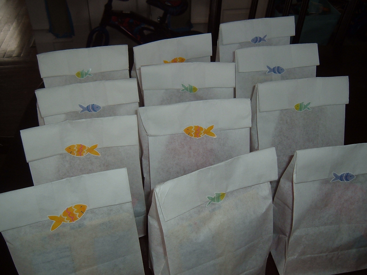 Thanks Susan! I noticed at the previous game that all of the kiddos fought over the same bag of cookies. I thought it would be easier just to make all of the snacks the same and in little surprise packs. The kids really liked the bags, and I used inexpensive Paper Lunch Sacks to put them together. Thade had fun putting together all of the packs, me too 😉