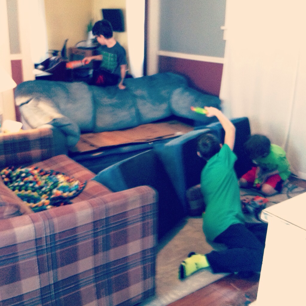 The kids had a day out of school, and my mom came up for a visit. Thade also had a friend over for the day. The boys broke out all of the nerf guns and had a huge battle downstairs.