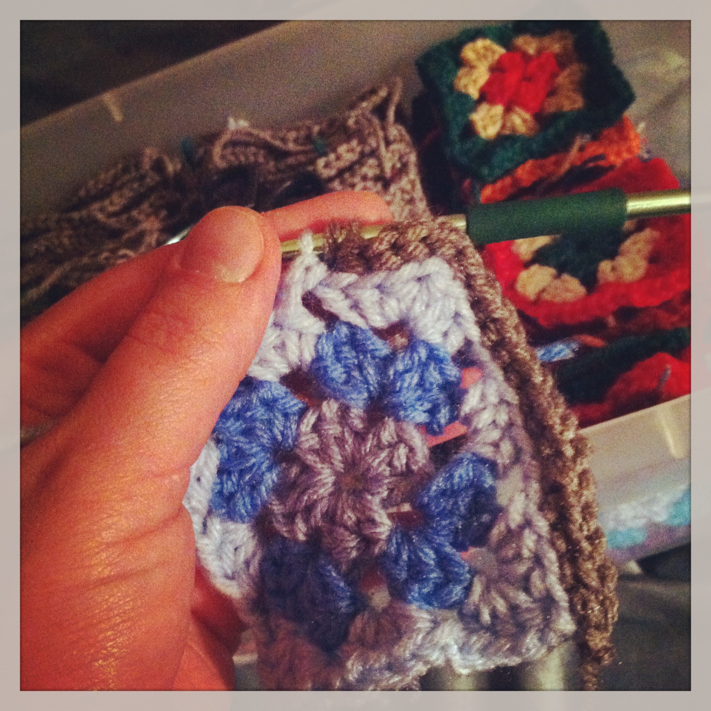 I’ve been crocheting a bit for the boy’s gift exchanges at school. I’m still working on finishing the big blanket for my brother too. I’m down to my last twenty granny-squares to crochet together, and then I have ten rows to crochet onto the main blanket. Then a lot of yarn to trim, and I think I’ll be done.