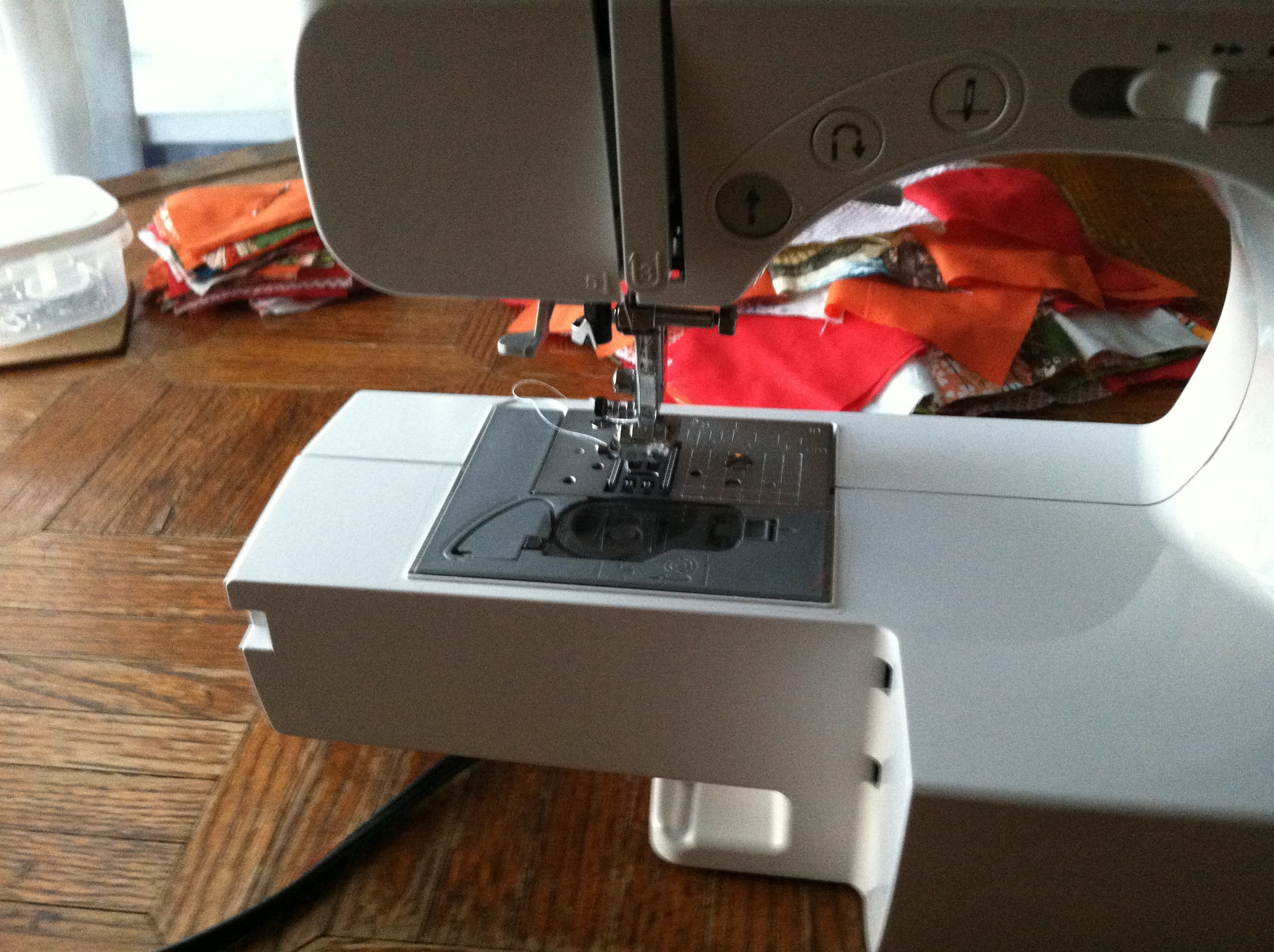 I still need to sew a few more patches, but I am loving the look of the quilt so far. There are pinks, purples, oranges, and light greens throughout the quilt. Now I need to make at least four more.