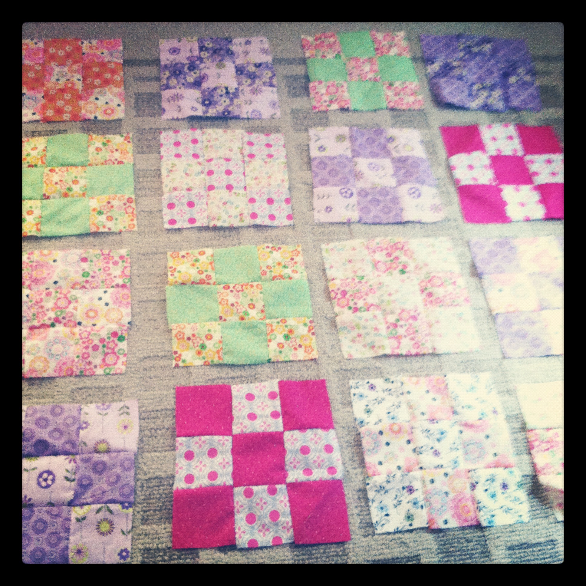 I finally got to sew a bit in the afternoon. I finished sewing all of the nine patch blocks that I pinned together yesterday.