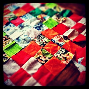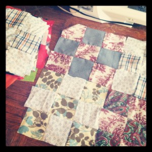 I decided to work on Agnes’ quilt a bit, and I took the pieces upstairs to map out a pattern.