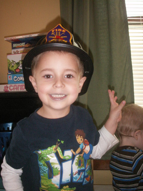 When I went to pick up Thade at school his teacher sent home the Firefighter handouts from Wednesday. There were stickers, pencils, and even a Firefighter helmet for Thade. She even sent one home for Dylan so he could play Firefighter too.